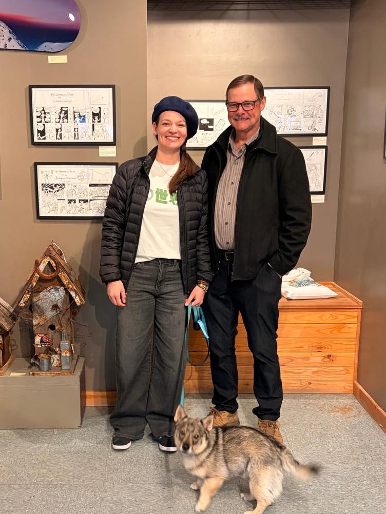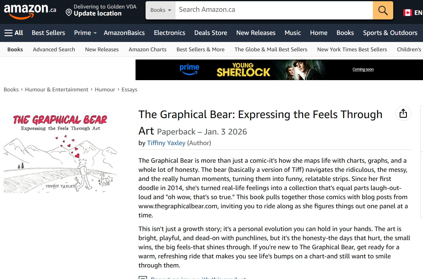 The picture at the top of this blog (not the pic of the Amazon page, obviously) is of me and my Dad (and my dog, as she’s really the star of the show, let’s face it) at my art opening at the Art Gallery of Golden last Friday. Notice my beret, yes that is the one I bought when I drew the “Bear-et” comic. I thought the perfect opportunity to wear it was an art opening. Not ironic at all. Only sassy.